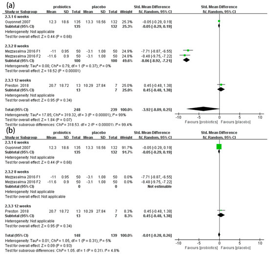 Three RCTs [50,53,54] involving 487 patients reported the effects of probiotics on QoL scores in IBS-C patients. Overall, the meta-analysis results demonstrate that there was no significant difference in QoL scores between the probiotic and placebo groups (SMD = −3.92, 95% CI [−8.09, 0.25], p > 0.05; Figure 7a). In the subgroup analysis, an eight-week duration showed good effects on improving QoL (SMD = −8.06, 95% CI [−8.92, −7.21], p < 0.05), but six-week (SMD = −0.05, 95% CI [−0.29, 0.19], p > 0.05) and twelve-week (SMD = 0.45, 95% CI [−0.48, 1.38], p > 0.05) durations showed no effects. The sensitivity analysis indicated that the results were unstable. After we excluded Mezzasalma’s two sets of data, there was no significant heterogeneity among the other studies (p = 0.31, I2 = 5%; Figure 7b).