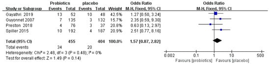 One study reported that adverse events were resolved by the end of the study, and not related to the probiotics [50]. Four RCTs [50,54,57,58] reported 54 patients with adverse events, including abdominal pain, anal irritation, gastroesophageal reflux, constipation, and cramping. The meta-analysis showed that there was no significant difference in adverse events between the probiotic and placebo groups (OR = 1.57, 95% CI [0.87, 2.82], p > 0.05; Figure 8).