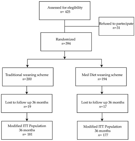 The primary aim of this RCT was to assess the effects of a weaning scheme based on fresh, seasonal and natural foods of the Med Diet on the medium-term adherence of the children to the Med Diet.