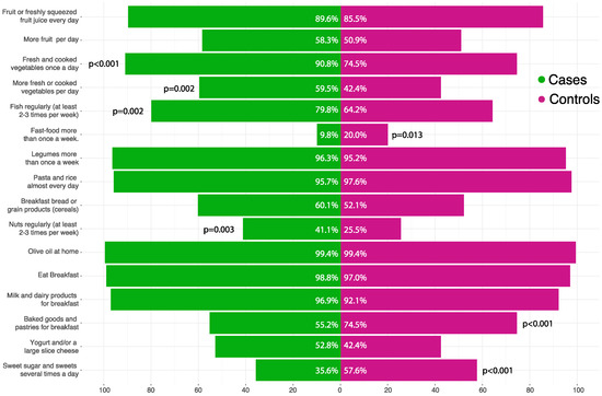 With respect to the single items of the KidMed questionnaire, children in the experimental group showed higher regular consumption of fresh and cooked vegetables (90.8% vs. 74.5%; p < 0.001), fish (79.8% vs. 64.2%; p = 0.002) and nuts (41.1% vs. 25.5%; p = 0.003) while were less likely to eat fast-food (9.8% vs. 20%; p = 0.013), baked good and pastries for breakfast (55.2% vs. 74.5%; p < 0.001) and sweets (35.6% vs. 57.6%; p < 0.001) (Figure 2).