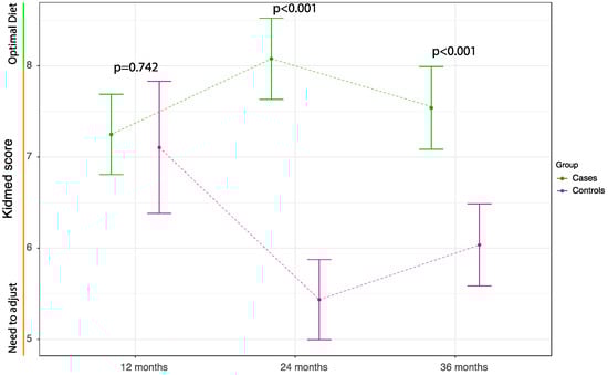Longitudinal trajectories of Med Diet adherence showed that difference between groups was not statistically significant in the first assessment, corresponding to an average age of 12.5 ± 1.8 months, but became significant from the second assessment corresponding to an average age of 24.8 ± 2.9 months (Figure 3).