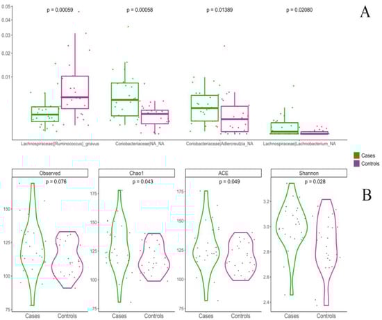 Boxplots showing the relative abundance of microbial taxa between the Med Diet group (green) and controls (pink). (A): boxes represent the interquartile range (IQR) between the first and third quartiles and the line inside represents the median (2nd quartile). Whiskers denote the lowest and the highest values within 1.5 × IQR from the first and third quartiles, respectively. Between groups differences were assessed by applying pairwise Wilcoxon test. (B): Violin plots showing the difference in four alpha-diversity indices between the Med Diet group and controls. Wilcoxon’s rank sum test was used to assess the significance.