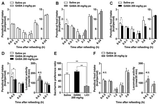 Oral GABA supplementation reportedly regulates brain functions including suppressing stress and enhancing sleep [33]. Central neurons regulating stress and sleep, such as corticotropin-releasing hormone-containing neurons and orexin neurons, also control food intake. Therefore, to evaluate its regulation of brain function, we investigated the effect of oral GABA on food intake. In overnight-fasted mice, po administration of GABA at 20 and 200 mg/kg but not 2 mg/kg immediately before the start of refeeding slightly and significantly decreased food intake only during 0–0.5 h after injection (Figure 2A–C). These periodic feedings during 0–0.5 h in both GABA groups (20 and 200 mg/kg) were approximately 85% of those in the saline group (Figure 2B,C). Subsequently, cumulative food intake at 24 h after po GABA returned to normal levels, and body weight was not altered (data not shown). Several compounds exhibiting short-term feeding suppression such as oleoylethanolamide [34] reportedly induce locomotor impairment or aversion. We therefore examined the effects of po GABA 20 or 200 mg/kg on the locomotor activity and taste aversion. Po administration of GABA (20 and 200 mg/kg) immediately before refeeding reduced food intake during 0–0.5 h after injection but did not alter locomotor activity (Figure 2D). In the taste aversion test, po GABA (200 mg/kg) or po saline did not influence saccharine preference, unlike lithium chloride (Figure 2E). These results suggested that po GABA administration induced satiation without aversion or locomotor impairment.
