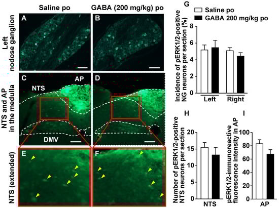 We investigated whether a single GABA administration by oral gavage increases the expression of phosphorylated ERK1/2 (pERK1/2), as cellular/neuronal activity markers [19,24,25,26,27,28,29,30], in vagal afferent neurons. Po administration of GABA only at 200 mg/kg did not change pERK1/2 expression in the neurons of right and left NGs 30 min after injection (Figure 4A,B,G). Furthermore, po GABA did not alter the expression of pERK1/2 in the medial NTS and AP, which are the projection sites of the vagal afferents [16,17,18] (Figure 4C–F,H,I).