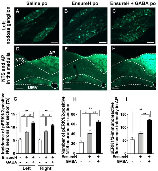 The coadministration of liquid diet EnsureH and GABA potentiates the postprandial activation of neurons in nodose ganglia (NGs), nucleus tractus solitarius (NTS), and area postrema (AP). (A–F): Left NG (A–C) and medial NTS and AP in the medulla (D–F) sections immunostained for ERK1/2 phosphorylation 30 min after po administration of EnsureH (40 mL/kg), EnsureH + GABA (40 mL/kg and 200 mg/kg), or saline (40 mL/kg) in overnight-fasted mice. Scale bar, 100 µm. (G–I): The incidence of pERK1/2-positive neurons in the left and right NG neurons (G) and the number of them in the bilateral NTS neurons (H). The fluorescence intensity of pERK1/2-immunoreactivity per unit area in AP is indicated in I. * p < 0.05, ** p < 0.01 by one-way ANOVA followed by Tukey’s test. n = 4. DMV, dorsal motor nucleus of vagus nerves. po, peroral. GABA: Gamma-aminobutyric acid. Dotted line: borderline indicating brain region. EnsureH+, po administration of EnsureH (gray columns). GABA+, po administration of EnsureH containing GABA (black columns). EnsureH– and GABA–, po administration of saline (white columns).
