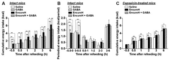 Finally, we investigated whether the coadministration of GABA and a liquid diet suppresses food intake via sensory nerves including vagal afferents. Po GABA administration (200 mg/kg, 40 mL/kg) alone 30 min before refeeding, compared with saline (40 mL/kg, po), did not alter food intake in normal overnight-fasted mice (Figure 7A,B). In Figure 7A,B, control mice administered saline consumed food containing approximately 1.3 kcal for 0.5 h after refeeding (Figure 7A,B, white bar). Then, we preadministered EnsureH with approximately 1.3 kcal (40 mL/kg, approximately 850 µL) into overnight-fasted mice 30 min before refeeding and measured food intake sequentially. Unexpectedly, EnsureH preadministration alone did not change periodic food intake for 1–6 h after refeeding (Figure 7B), thereby inducing overeating until 6 h after refeeding (Figure 7A). This result indicates that meal intake by oral gavage exhibits a low potency to induce satiation. In contrast, the coadministration of EnsureH (40 mL/kg) and GABA (200 mg/kg) by oral gavage 30 min before refeeding remarkably suppressed food intake for 0–0.5 h after refeeding and thereby prevented overeating (Figure 7A,B). The feeding suppression by EnsureH + GABA was completely blunted in systemic capsaicin-treated mice (Figure 7C). These results suggest that the coadministration of GABA and a liquid diet potentiates meal-evoked satiation and prevents overeating via sensory nerves including vagal afferents.