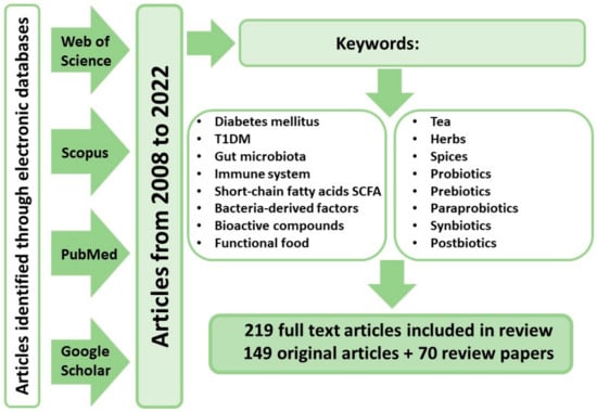 The analysis of information available in the global scientific literature was conducted in August 2021 using the following databases: PubMed, Scopus, Google Scholar, and Web of Science. The databases were searched for both joint and separate instances of the keywords, e.g., “autoimmune diabetes”, “diabetes”, “T1DM”, “gut microbiota”, “tea”, and “herbs” in both Polish and English languages (Figure 1). Based on the titles and synopses, articles unrelated to the substantive criteria were excluded, and the remaining original and review papers were intensely analyzed to identify the most pertinent publications. Bibliographies were also reviewed in all the selected articles to identify other potentially viable texts. The search was narrowed to papers published between 2008 and 2022. Ultimately, a total of 2646 publications were reviewed, of which 219 were used: 149 research reports and 70 reviews.