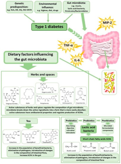 T1DM is a disease marked by oxidative stress, chronic inflammation, and the presence of autoantibodies [3]. The gut microbiota has been shown to be involved in the alleviation of oxidative stress [9] and inflammation [10], as well as strengthening immunity [11]; thus, its possible involvement in the pathogenesis of T1DM was highlighted. The intestinal commensal microbiota is a unique ecosystem associated with various functions of the living organism, especially those related to immunity. Dysbiosis of the intestinal microbiota plays a key role in the pathogenesis of autoimmune diseases [12]. Microbiome modulation is one of the most promising new strategies in medicine to improve the health of people with autoimmune diseases [12,13]. The goal of the present study is to analyze the information on the relationship between the structure of the intestinal microbiome and the occurrence of T1DM. The possibilities of supporting the intestinal microbiota by introducing certain food products into the diet, such as tea, herbs, and spices, as well as probiotics and prebiotics as methods of diet therapy supporting the pharmacological treatment of T1DM are also analyzed.