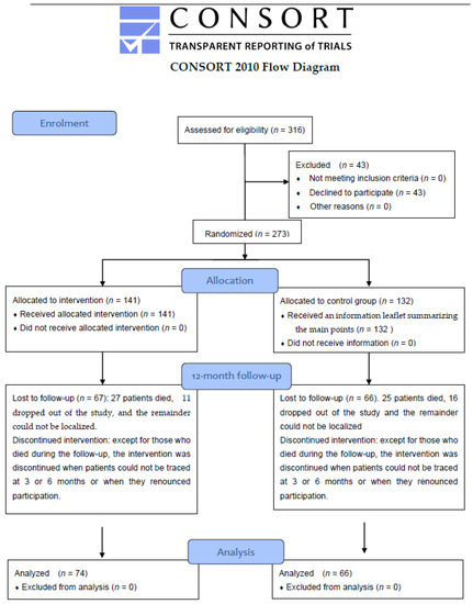 APA StyleHerrera-Espiñeira, C., Martínez-Cirre, M. d. C., López-Morales, M., Lozano-Sánchez, A., Rodríguez-Ruíz, A., Salmerón-López, L. E., Gómez-Crespo, M. I., & Expósito-Ruíz, M. (2022). Hospital Intervention to Reduce Overweight with Educational Reinforcement after Discharge: A Multicenter Randomized Clinical Trial. Nutrients, 14(12), 2499. https://doi.org/10.3390/nu14122499