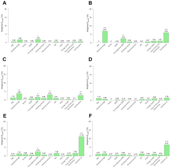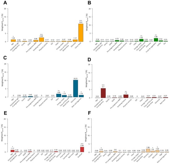 Weighted Rpartial2 for each factor showing the percentage of explained variability in: (A) Myristic acid (14:0), (B) Pentadecanoic acid (15:0), (C) Heptadecanoic acid (17:0), (D) Eicosapentaenoic acid (EPA, 20:5n-3), (E) Docosahexaenoic acid (DHA; 22:6n-3), and (F) EPA + DHA in FAMILY cohort. Statistical significance was based on ordinary least squares regression. * p ≤ 0.05, ** p ≤ 0.01, *** p ≤ 0.001.