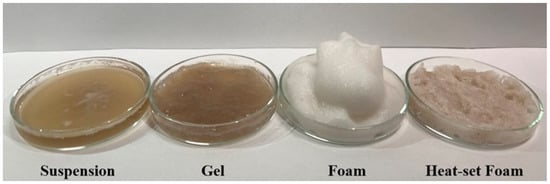 The residual trypsin inhibitory activity (TIA) present in the various PoPI processed samples was estimated (Table 1). All samples still showed residual trypsin inhibitory activity. The results support the findings described in Figure 3, in which TI bands were present in the undigested samples. The PoPI dispersion (72.8% ± 1.1) had the highest TIA, fully in agreement with the native character of the isolate. As expected, the unheated foam, PoPI-F (67.9% ± 2.9), also showed a high TIA, and no significant difference compared to the dispersion. Despite the drastic change in food structure, there was no surface denaturation of the TI. Heating treatment, on the contrary, showed a decrease in TIA; PoPI-G showed a slight reduction to 62% of TIA, and in the case of PoPI-HF, the reduction was significantly lowered to 25.6%. It has been previously shown that the structural change in protein natural conformation caused by heat-induced denaturation produced a non-reversible change, leading to a loss of inhibitory activity [,,,,].