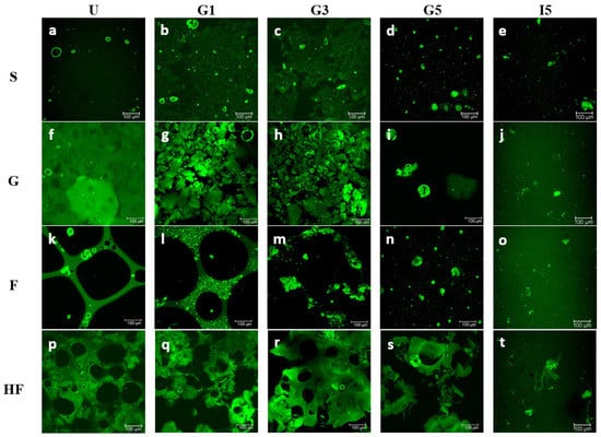 The visual appearance of the four structures prepared from the potato protein isolate is shown in Figure 1. Representative microstructure images corresponding to each of the four different potato protein treatments (PoPI-S, PoPI-G, PoPI-F, PoPI-HF) are presented in Figure 2. Images depict, for the same treatment, the initial samples (U), sequential stages of gastric emptying (G1, G3 and G5) and the final intestinal stage (I5). The latter represents the most extensively digested sample after simulated intestinal digestion. Figure 2 shows visible differences between the colloidal structures of the four matrices, before and throughout the in vitro digestive process. Images at higher magnification can be also found in the Supplementary Material.