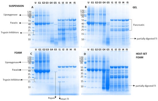 With the aim of understanding the differences in the extent of protein breakdown between the four different isocaloric matrices prepared with potato protein, their non-digested state (U) as well as their digesta were analyzed at each in vitro gastrointestinal point (G1–G5, I1–I5) using SDS-PAGE (Figure 3). These samples represented the state of the protein transiting to the upper intestine at various digestion times. All samples shared a similar electrophoretic pattern at the initial stage (U), and their bands were assigned as reported in the literature [,]. Two main bands were present, a high molecular weight (Mw) protein (migrating at approximately 130 kDa) corresponding to lipoxygenase, and a second large band migrating at about 43 kDa corresponding to patatin. The protein isolate was mostly comprised of patatin; however low intensity bands were also noted for the trypsin inhibitor (TI) protein group (migrating at about 22, 15 and 9 kDa) (with two bands at 15 and 9 kDa). There were clear differences in the protein hydrolysis during gastrointestinal transit between the unheated and heated samples (Figure 3A–D). The PoPI-S and PoPI-F (Figure 3A,C) followed a similar gastric digestion pattern: the Mw of all band fractions remained unaltered from G1–G3, which indicated resistance to proteolysis by pepsin, yet due to the pH conditions they were non-optimal for the gastric enzyme’s activity []. However, at the two last emptying points, G4 and G5, a much higher extent of hydrolysis was noted, with only traces of patatin present, as well as some products of hydrolysis migrating at low Mw. At these two emptying points, conditions were ideal (highest pepsin concentration and pH ~2.0). At G5, a clear band appeared at 37 kDa, corresponding to pepsin, as the enzyme had reached high concentrations in the gastric digesta. It is important to note that when comparing G5 for PoPI-S and PoPI-F, there were some differences in the polypeptide distribution, with larger fragments left in the suspension, compared to the PoPI-F foam samples, and higher amounts of trypsin inhibitors still intact. Figure 3A,C also show the various stages of emptying after intestinal digestion (I1-I5) for PoPI-S and PoPI-F. There seemed to be more undigested protein in the suspension compared to the foam (Figure 3A,C), and the trypsin inhibitor bands were still visible at 15 kDa, in both suspension p0 and foam samples at the early stages of gastric emptying.