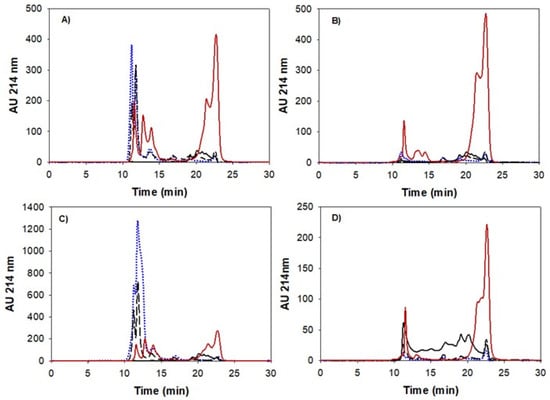 Representative elution patterns for supernatants of the digestates at G1, G3, G5 and I1 analyzed by size exclusion chromatography (see methods) for potato protein isolates: suspension (A), gel (B), foam (C), heated foam (D). Standard peaks elution: 100 kDa–10.6 min, 30 kDa–13 min, 1 kDa–19 min. G1 (dotted blue line), G3 (broken line), G5 (continuous black line) and intestinal, corresponding to G1 (red line).
