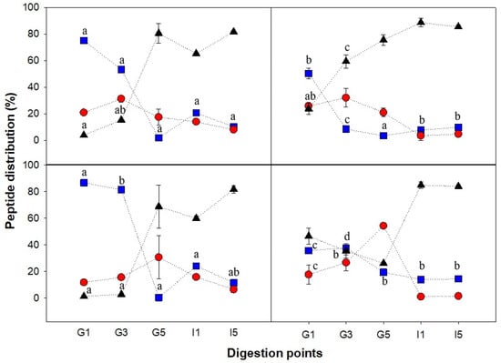 Molecular weight distribution of the peptides present in the soluble fraction of the four potato protein isolate (PoPI) samples. Suspension (a), gel (b), foam (c), heat-set foam (d). Three different Mw ranges are presented: 80–30 kDa (squares), 30–1 kDa (circles), <1 kDa (triangles). Bars represent standard deviation. Letters indicate differences within the same Mw population. Lines are drawn to guide the eye. Gastric stages: G1 (8.26 min), G3 (24.78 min), G5 (41.30 min), and corresponding intestinal points (I1 and I5).