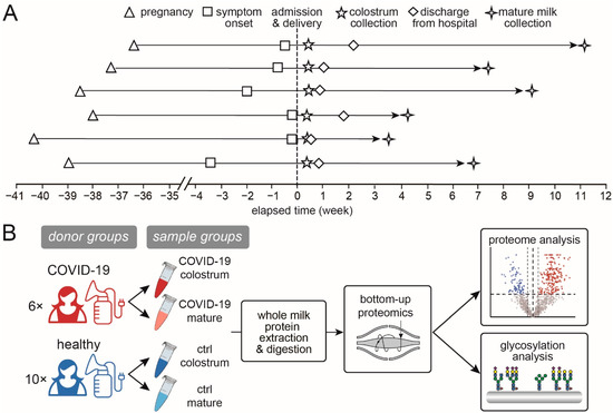 In this work, we used mass spectrometry (MS)-based proteomic analysis to characterize the immune-related proteins in breast milk collected from both six COVID-19 patients and ten healthy donors and then compared the results from those two groups. Both colostrum and mature milk were examined to monitor dynamic proteomic changes. Most human milk proteins are glycosylated and the glycosylation pattern importantly aids in morbidity reduction [10] by both affecting proteolytic susceptibility [11] and serving as immunomodulators [12] and competitive inhibitors of pathogen binding [12,13]. Therefore, we expanded the scope of this study to the glycoproteomic level by thoroughly characterizing a panel of key immune-related proteins’ glycosylation patterns to reveal the COVID-19-induced dynamic glycoproteome evolvement. We show that combined proteomic and glycoproteomic strategies can provide straightforward nutrition and immunity information that can help professionals recommend appropriate infant feeding procedures for infected mothers.