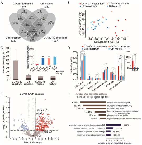 Of the 1573 proteins identified in the 4 milk groups, 1439 were sufficiently abundant to be quantitatively monitored, and 1123 of those (78%) were shared by all groups (Figure 2A, Table S1). Principal component analysis (PCA) suggested a distinction between the COVID-19 colostrum group and the other three groups, indicating an alteration in milk proteome upon active SARS-CoV-2 infection (Figure 2B). The total protein content in the COVID-19 colostrum group was 4.1 times higher than that in the control colostrum group; particularly, casein proteins were 3.9 times lower and whey proteins were 7.2 times higher (Figure 2C). As the major components of milk, whey proteins and caseins (comprising about 45–97% and 3–55% of human milk proteins, respectively) figure importantly in nutrition and immunity [24], including being sources of amino acids, enhancing micronutrient bioavailability, providing immunogenic training for innate and adaptive immunity, and promoting intestinal growth and maturation via interactions with the microbiome [25]. The proportion of casein proteins in the COVID-19 colostrum group was lower than that of the other groups (p < 0.0001; Figure 2C), likely because of the downregulation of all caseins (α-S1-, β-, κ-caseins) and an increase in the total abundance of whey proteins. In detail, Among the highly abundant milk proteins, beta-casein and immunoglobulins (predominated by sIgA1) were significantly down- and upregulated, respectively (Figure 2D). The differences between COVID-19 milk and Ctrl milk protein contents at the mature stage were not significant (Figure 2C,D).