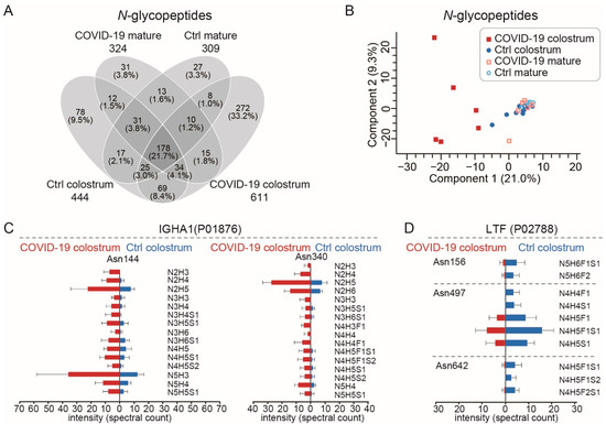 The glycoproteomes of each sample group. (A) A Venn diagram showing the numbers of N-glycopeptides that could be quantitatively monitored. The numbers of N-glycopeptides for each group are shown below the group name. (B) Principal components analysis plot of N-glycopeptides. (C,D) Site-specific changes in N-glycopeptides of IGHA1 (immunoglobulin heavy constant alpha 1) (C) and LTF (lactoferrin) (D) between COVID-19 colostrum and Ctrl colostrum groups. Bars indicate means and whiskers indicate SDs.