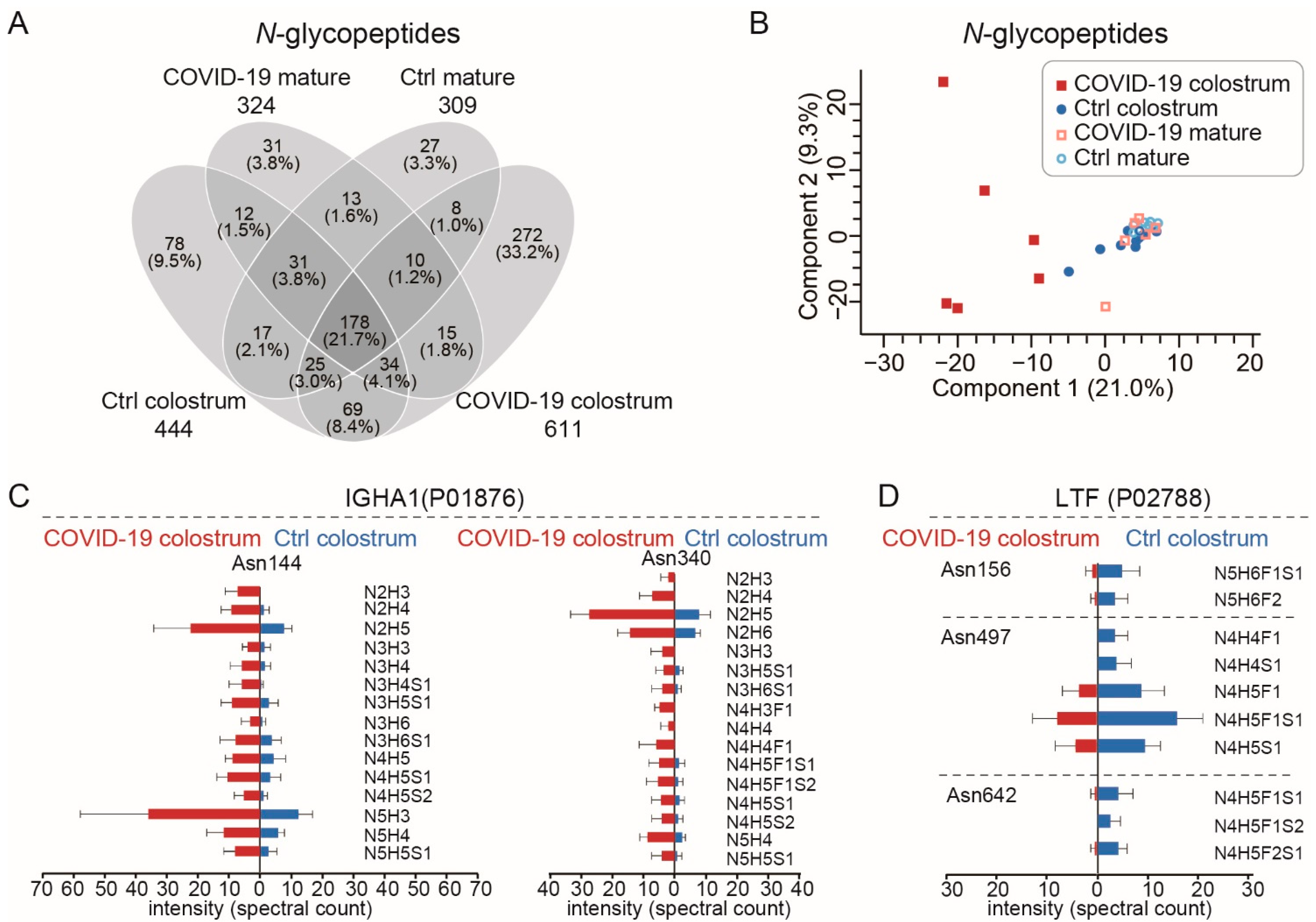 3.3. The Increased Microheterogeneity of Overall Protein Glycosylation and the Glycosylation Levels of Immune-Related Proteins in the COVID-19 Colostrum Proteome