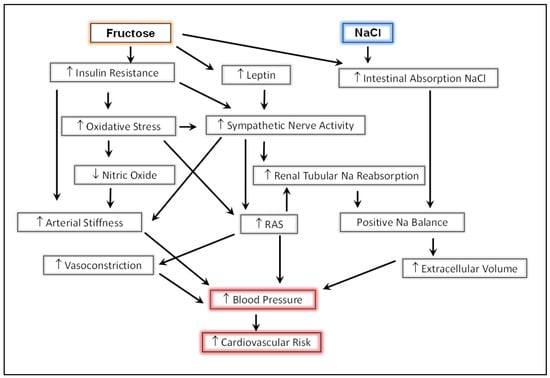This review focuses on the impact of fructose and salt consumption on the development of hypertension, independent or preceding the full expression of metabolic syndrome, which may lead to heightened cardiovascular risk. The influence of fructose on metabolic syndrome is well recognized and reviewed in detail in several recent reviews [20,21,22,23].