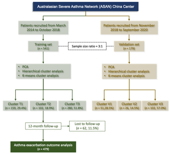 The ASAN (https://www.severeasthma.org.au, accessed on 13 June 2022) is a multicenter clinical research network (Australia, Singapore, China, and New Zealand) in a real-world setting. This study included two prospective observational cohort studies which were conducted from March 2014 to October 2018 (541 patients; cohort 1 as training set) and November 2018 to September 2020 (179 patients; cohort 2 as validation set) (Figure 1). The sample size ratio of training set and validation set was 3:1. Adults (≥18 years old) with a diagnosis of stable asthma according to the Global Initiative for Asthma (GINA) (21) criteria were consecutively recruited at the clinic of West China hospital, China (ASAN China Center, Chengdu, China). Stable asthma was defined as no respiratory tract infection and no exacerbation or systemic corticosteroid use in the previous 4 weeks. The inability to understand the questionnaires, perform spirometry or sputum induction, pregnancy, and breastfeeding were also listed as exclusions. Cohort 1 was used for performing cluster analysis (training set) and cohort 2 for validating the clusters identified in training set. Data from training set were used to identify clinical asthma phenotypes by cluster analysis. The patients in training set were followed-up for 12 months to monitor asthma exacerbations (AEs) and to validate the effect of the identified clusters on AEs. To assess whether the cluster analysis in training set had reproducibility, the same algorithm of cluster analysis in training set was used for the validation set. As a real-world study, indications for patient treatment were based on the GINA recommendations [21]. Step-up or step-down treatments were adjusted in a continuous cycle of assessment, treatment, and review. This study was approved by the Institutional Review Board (IRB) at West China Hospital, Sichuan University (Chengdu, China) (No. 2014–30) and registered at Chinese Clinical Trial Registry (ChiCTR-OOC-16009529; https://www.chictr.org.cn, accessed on 13 June 2022). All participants provided written informed consent.