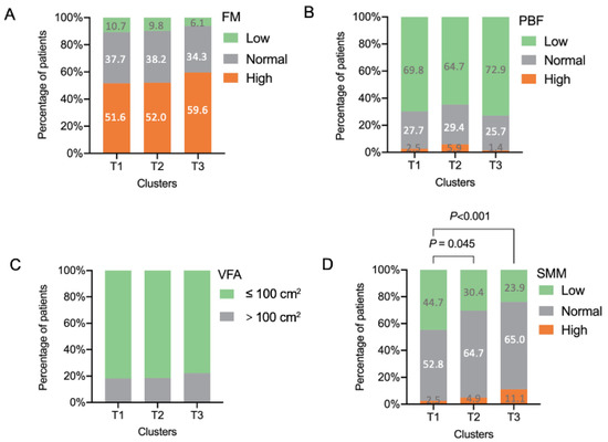In our study, patients in cluster T1 presented with lower BMI (22.36 (19.97, 24.15) kg/m2), FM (15.24 (5.41) kg), PBF (27.24 (7.50) %), VFA (70.66 (29.84) cm2) (p < 0.05) (Table 1), and lower SMM (21.57 (4.07) kg) and proportion of patients in the low level of SMM (44.7%, p < 0.001) (Figure 2) compared with those in cluster T3. Undernutrition is characterized by a reduction of the fat-free mass (FFM, mainly SMM) and fat mass (FM) [43]. Therefore, compared with cluster T2 and T3, cluster T1 was defined as “patients with undernutrition”.