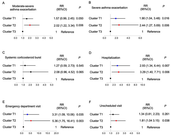 Correlations of 3 identified clusters with (A) moderate-to-severe exacerbation, (B) severe exacerbation, (C) systemic corticosteroid burst, (D) hospitalization, (E) emergency department visit, and (F) unscheduled visit; logistic regression analysis, with cluster 3 as the reference. CI, confidence interval; RR relative ratio. Blue, cluster T1; Red, cluster T2; Black, cluster T3.