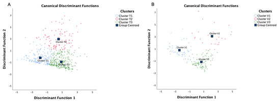 Canonical discriminant function analysis of the patient in (A) the training set and (B) the validation set. By using a stepwise method of discriminant analysis, three clusters were separated in the two sets. Cluster T, clusters identified in the training set; Cluster V, clusters identified in the validation set.
