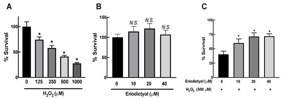 Eriodictyol inhibited H2O2-induced cytotoxicity in dermal fibroblasts. (A) H2O2 exposure (125–1000 µM; 1 h) resulted in a concentration-dependent decrease in the viability of BJ cells. (B) Eriodictyol treatment (10–40 µM; 24 h) did not result in cytotoxicity in BJ cells. (C) Eriodictyol pretreatment (10–40 µM; 24 h) prevented H2O2-induced cytotoxicity (500 µM; 1 h) in BJ cells. Cell viability was observed using the MTT assay after the indicated treatments. The survival percentage was calculated relative to untreated controls. DMSO (0.5%) was used as a vehicle control (n = 3; each biological replicate consisted of four independent wells; mean ± SEM). * p < 0.05 versus vehicle controls (A) and p < 0.05 versus H2O2-treated cells (C). N.S., not significant.