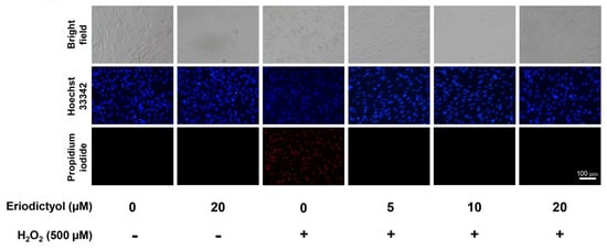 Under light microscopy, eriodictyol prevented the changes in the morphological features of necrosis following H2O2 exposure (Figure 2; bright field), suggesting an anti-necrotic activity of this flavonoid. Furthermore, the fluorescence microscopic images with Hoechst 33342/PI dual-staining demonstrated that supplementation with eriodictyol (5–20 µM) strongly prevented necrosis induction following exposure to H2O2 (Figure 2; absence of PI-positive cells). Altogether, these results suggest that eriodictyol could inhibit oxidative injury of H2O2 through the inhibition of necrotic cell death.