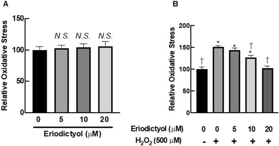 Eriodictyol inhibited oxidative stress in BJ cells following H2O2 exposure. (A) Eriodictyol treatment (5–20 µM; 24 h) did not alter the redox status of BJ cells. (B) Eriodictyol pretreatment (10–20 µM; 24 h) inhibited H2O2-induced oxidative stress (500 µM; 1 h) in a concentration-dependent fashion. Oxidative stress was immediately evaluated using the DCFH-DA assay after the indicated treatments. Relative oxidative stress was calculated compared with that in untreated controls. DMSO (0.5%) was used as a vehicle control (n = 3; each biological replicate consisted of three independent wells; mean ± SEM). * p < 0.05 versus untreated controls; † p < 0.05 versus H2O2-treated cells. N.S., not significant.