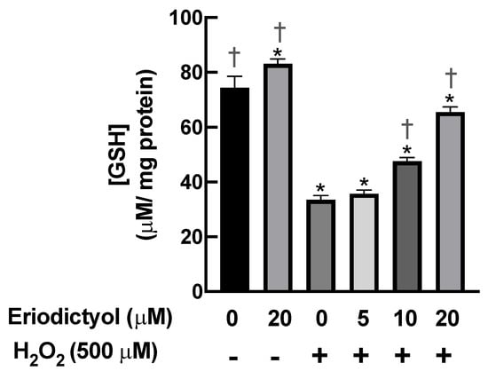 Eriodictyol restored the intracellular levels of reduced glutathione following H2O2 exposure. H2O2 (500 µM; 1 h) rapidly decreased the availability of GSH in BJ cells. Eriodictyol pretreatment (10–20 µM; 24 h) maintained the intracellular levels of GSH in a concentration-dependent fashion. DMSO (0.5%) was used as a vehicle control (n = 3; each biological replicate consisted of three independent wells; mean ± SEM). * p < 0.05 versus vehicle controls; † p < 0.05 versus H2O2-treated cells.