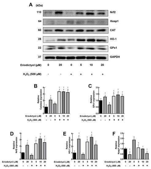 Eriodictyol promoted the expressions of CAT and GPx1 via Nrf2 cascade. (A) Western blot assay demonstrated that supplementation with eriodictyol (5–20 µM; 24 h) enhanced the expressions of CAT and GPx1 in BJ cells following H2O2 treatment (500 µM; 1 h). The upregulation of these H2O2-removal enzymes is possibly due to the activation of the Nrf2 pathway, as observed by an increase in the expression levels of Nrf-2 and its downstream target HO-1 and a decrease in Keap1 protein expression. GAPDH was used as a loading control. DMSO (0.5%) was used as a vehicle control. Results are representative of three independent experiments. Full unedited blots are shown in Supplementary Figure S2. (B–F). The band intensity of certain proteins from Western blot analysis was quantified with Image J software and normalized to loading control GAPDH. Data represent mean ± SEM of protein expression with respect to untreated control (n = 3). * p < 0.05 versus vehicle controls; † p < 0.05 versus H2O2-treated cells.