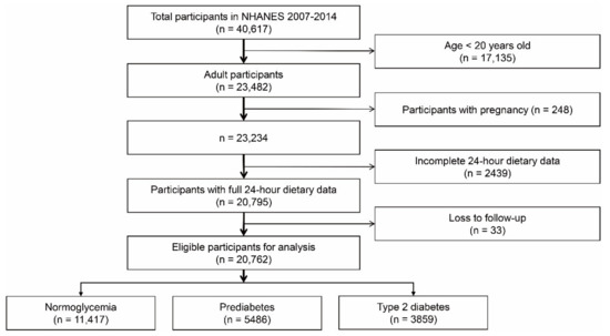 This cohort study was conducted following the Strengthening the Reporting of Observational Studies in Epidemiology (STROBE) reporting guideline for cohort studies [30]. The participants included in our analysis were extracted from the National Health and Nutrition Examination Survey (NHANES), a periodically conducted survey that obtains nationally-representative samples of the general Americans with a complex, multistage probability design [31]. In this study, we extracted participants from the 2007–2014 cycle. Adults with complete 24-h dietary data were included. The exclusion criteria included: (1) age <20 years old; (2) participants with pregnancy; and (3) participants without endpoint information.