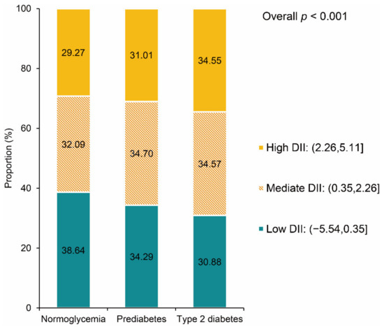 Compared with the normoglycemia group (0.883, 95% CI: 0.793, 0.973), participants with prediabetes (1.081, 95% CI: 0.981, 1.181) and type 2 diabetes (1.249, 95% CI: 1.151, 1.346) had higher DII scores (overall weighted p < 0.001). Figure 2 presents the distribution of DII scores among three groups. The proportion of high DII scores was higher in participants with prediabetes or type 2 diabetes. Moreover, we compared the component of DII scores among the three groups to find the main cause of the difference.