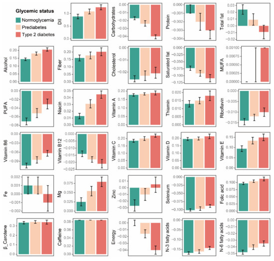 Participants with type 2 diabetes had higher scores in alcohol, fiber, MUFA, PUFA, niacin, thiamin, riboflavin, vitamin B6, vitamin C, vitamin E, Mg, Zinc, Selenium, folic acid, N-3 fatty acids, and N-6 fatty acids (Figure 3, Table 2). We also noticed lower scores of participants with type 2 diabetes in certain components, such as carbohydrates, protein, total fat, saturated fat, vitamin B12, Fe, and energy. When compared to the normoglycemia group, the DII component scores remained consistent between participants with prediabetes and type 2 diabetes but to a lesser extent in the former.