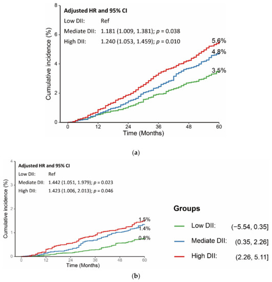 The association was stable after adjusting for age, sex, educational level, BMI, smoke, hypertension, hyperlipidemia, glycemic status, recreational activity, and alcohol consumption. Compared with participants with low DII scores, participants with mediate or high DII scores had higher risk of all-cause death (Mediate DII: adjusted HR: 1.181, 95% CI: 1.009, 1.381; p = 0.038; high DII: adjusted HR: 1.240, 95% CI: 1.053, 1.459; p = 0.010) and cardiovascular death (adjusted HR: 1.442, 95% CI: 1.051, 1.979; p = 0.023; high DII: adjusted HR: 1.423, 95% CI: 1.006, 2.013; p = 0.046) (Figure 4, Table S1 in the Supplementary Materials).