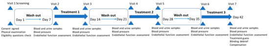 The 2nd, 4th, and 6th visits were the baseline visits for each treatment. These visits took place 1 week after the last visit (ideally the same day of the week). Participants completed their urine collection on the morning of this visit and brought this sample with them to the laboratory (second urination of the morning). Their 1-day food diary questionnaire was also returned. The participants arrived at the laboratory having not consumed any food or drink other than water for 12 h prior. Upon arrival at the lab, the researcher (YW) checked that they still complied with the inclusion/exclusion criteria and were in good health and were well-rested. Changes to medication and/or illness between visits were recorded if applicable. At this session, they were required to bring the 20 mL spot urination in the morning. Then, 10 mL of their venous blood sample was taken by a suitably qualified individual for a biochemistry clinical measurement (YW) (approx. 10 min). Then, their systolic and diastolic blood pressure were measured (approx. 15 min). The next step was the non-invasive measurement of pulse wave velocity, which was taken to assess participants’ endothelial function (approx. 15 min). This was the completion of participant testing. Participants were provided with a 1-day food diary and a urine sample kit upon their departure to record their food intake of the day prior to their next visit and were reminded to bring their 2nd urination on the next visit day. The participants were instructed to take their treatment for the following 1 week and to adhere to the instructions and consume the randomly assigned supplementation. All supplementations were provided to the participants on their departure.