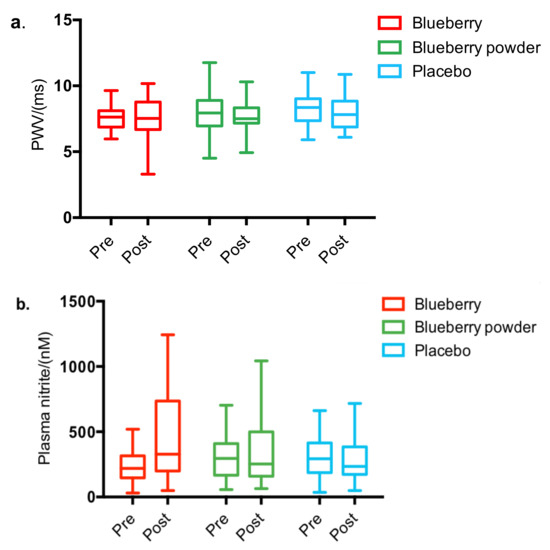 The effect of blueberry interventions on selected cardiovascular function endpoints, including (a) PWV and (b) plasma nitrite levels.