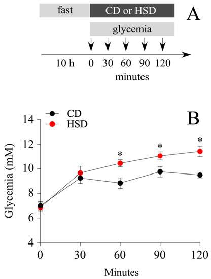 HSD-induced short-term glycemic changes. (A) After a 10 h fast (9 a.m. to 19 p.m.), male rats were fed ad libitum on the HSD and CD diets. Their glycemia was measured before and after feeding. (B) Variation in glycemia (mM) before and 30, 60, 90 and 120 min after the administration of the HSD and CD diets. n = 5 animals per condition; the data is represented as the mean ± sem; (*) p < 0.05; t-Student test.