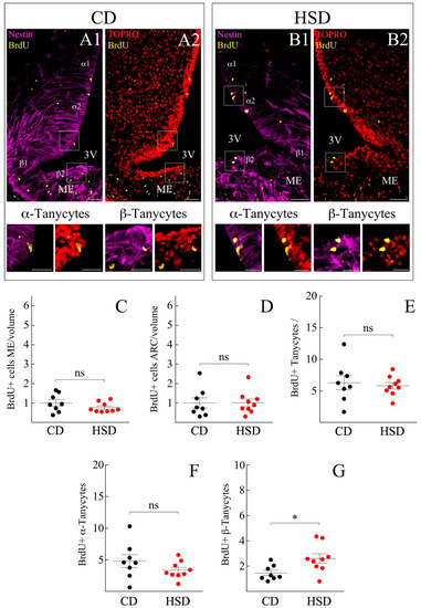 We detailed the proliferative response of each tanycyte subpopulation according to Robins et al. and Rodríguez et al. [3,48]. We first analyzed α1- and α2-tanycytes that form the dorsal and ventral portion of the 3V lateral wall, respectively. Again, no significant changes were observed in the BrdU incorporation by α1/α2-tanycytes exposed to HSD compared to CD (3.3 ± 0.5 vs. 4.8 ± 1.0 cells/30 μm, respectively) (Figure 3F). β1-tanycytes line the most basal lateral wall and a small portion of the 3V floor, whereas β2-tanycytes completely cover the 3V floor. The prolongation of the former reaches the ME, contacts the fenestrated capillaries, and forms a physical barrier that allows the permeation of systemic molecules to the hypothalamic parenchyma [41]. The β1-tanycytes were much slower dividing than the rest of the tanycyte-groups (data not shown), for which their BrdU incorporation was excluded from the quantification. β2-tanycytes responded to the rise of dietary fructose by significantly increasing their cell-division rate, from 1.5 ± 0.2 cells/30 μm under CD to 2.6 ± 0.4 cells/30 μm after HSD (Figure 3G).