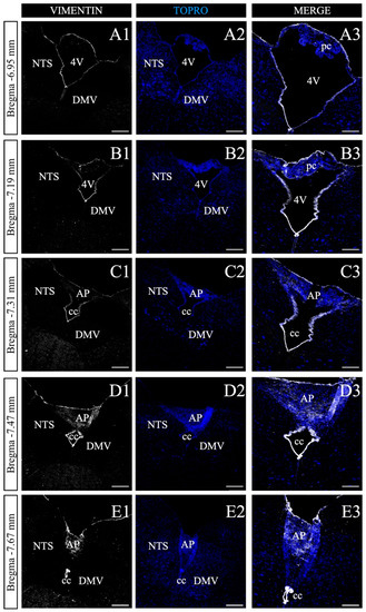 We next sought to perform a serial histological map of the DVC to recognize the poorly characterized area harboring the NPs. Seven micrometer thick coronal sections of adult mice were selected every 35 μm in the anteroposterior axis, within the bregma range of −6.95 to −7.67 mm (Figure 4), according to the mouse brain stereotaxic atlas [49]. As shown in Figure 4, this region is defined by the presence of the fourth ventricle (4V) and the central canal (CC), which similar to all ventricles, are lined by vimentin+ ependymal cells (Figure 4A). The presence of the choroid plexuses identified by their characteristic cellular structure and organization in the roof of the 4V is also of note (Figure 4A1,B3). Due to nuclear staining (TOPRO-3 in blue), it was possible to recognize cell clusters corresponding to NTS and dorsal motor nucleus of the vagus (DMV) (Figure 4A2). As more posterior sections were analyzed, a clear reduction of 4V is observed (Figure 4C1), giving rise to the CC (Figure 4C1–E3); likewise, the disappearance of the choroid plexuses and the emergence of the AP (Figure 4C3), where a significant number of vimentin+ vagliocytes reside [39,40]. According to the previous analysis, the coordinates that comprise the entire AP structure are in the anteroposterior axis, between the −7.47 and −7.67 mm bregma for the mouse brain, and −13.28 and −14.68 mm bregma for the rat brain, according to the mouse and rat stereotaxic brain atlas [49].