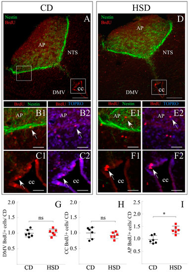 The effect of the HSD on DVC was evaluated in the same animals used for the previously described hypothalamus analysis to reduce the experimental n. For this aim, the posterior midbrains (including cerebellum) were dissected and sections between −13.68 and −14.68 mm bregma were selected. The sections were processed by immunohistochemistry to identify precursor cells with cumulative proliferative activity (Nestin+/BrdU+ cells) in the parenchyma of nearby neuronal nuclei (Figure 5A–F2). Cell clusters with these characteristics were found in DMV (Figure 5A,D), AP, and NTS (Figure 5B,E), as well as at the dorsal roof of the CC (Figure 5C,F) for the CD and HSD, respectively.