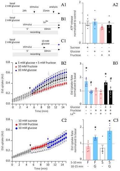 Moreover, cells residing in both the hypothalamus and DVC, are endowed with the molecular machinery essential to monitor changes in glucose levels and thus participate in energy regulation circuits; tanycytes express GLUT1, GLUT2, and the glucokinase enzyme, while in DVC, a subset of GLUT2+ neurons have been detected [60,61,62]. The function of the latter is well known; these neurons stimulate glucagon and insulin production in hypoglycemic/fasting and hyperglycemic situations, respectively [61,63]. As part of the tanycytic glucosensing mechanism, connexin 43 has been shown to play an essential role, creating a broad panglial coupled network likely to amplify the detection of the metabolic stimulus [64], acting as non-docked HC, and regulating the release of signaling molecules, such as ATP, for activating purinergic signaling [38]. Taking these milestones into account, we wondered if fructose was able to open HCs as glucose does.