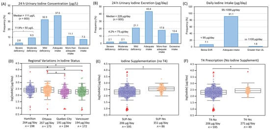The iodine status of participants from the PURE-24USE study (n = 800) based on (A) 24 h UIC (μg/L) and (B) 24 h UIE (μg/day). Median iodine concentrations indicated iodine adequacy (111 μg/L or 226 μg/day, where error is ±IQR) with a low prevalence of moderate to severe iodine deficiency in the population (<20%). (C) Daily iodine intake confirmed only a small fraction of adult Canadians in our cohort were below EAR (7.1%, <95 μg/day) or greater than UL (1.8%, ≥1100 μg/day). (D) Regional variations in iodine nutrition were found with residents from Quebec City and Vancouver having lower iodine status than Hamilton or Ottawa (F = 8.80, p = 9.82 × 10−6, n = 737; where * p < 0.014 for pairwise comparisons). Participants who (E) reported use of multivitamin supplements containing iodine, but no T4 (F = 42.3, p = 1.52 × 10−10, n = 681), or (F) were prescribed T4, but not taking iodine supplements (F = 9.71, p = 1.91 × 10−3, n = 644) had greater iodine status than controls. All ANCOVA were adjusted for age, sex, BMI, total caloric intake, AHEI score, education, alcohol use, and smoking status.