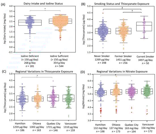 (A) Dairy intake was the most significant dietary exposure associated with iodine deficiency (F = 18.7, p = 1.75 × 10−5, n = 725), whereas (B) current smoking was a lifestyle factor associated with elevated urinary thiocyanate excretion as compared to former or never smokers (F = 19.5, p = 5.82 × 10−9, n = 654). Modest regional variations in exposure to environmental iodide uptake inhibitors, (C) thiocyanate and (D) nitrate were found. Overall, residents from Quebec City were exposed to both higher thiocyanate (F = 3.32, p = 0.0194, n = 654) and nitrate (F = 3.61, p = 0.0130, n = 737) relative to Hamilton when using ANCOVA after adjustment for covariates with a Bonferroni correction (* p < 0.05).