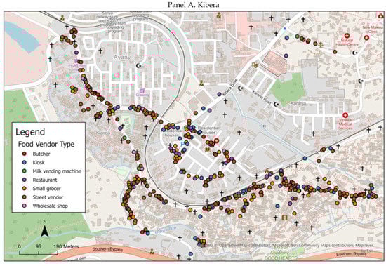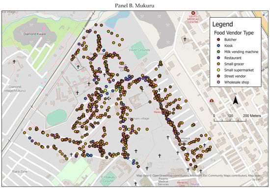 A map of the different types of food vendors in Kibera (Panel A) and Mukuru (Panel B).