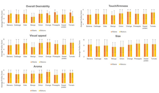 We examined the quality of fruits and vegetables being sold within the slums using the ProDesirability tool. Figure 3 and Supplementary Table S4 provide an overview of the sensory ratings for key fruits and vegetables in both informal settlements. We found more favorable ratings of the overall desirability (p = 0.011), size (p = 0.008), and aroma (p = 0.01) properties of fruits and vegetables in Kibera as compared to Mukuru. The overall desirability of fruits and vegetables was high, with little variability across settings and fruit and vegetable types. Pineapples and onions had the highest scores, and mangoes had the lowest.