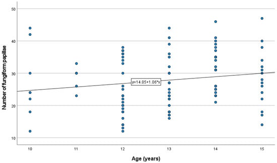 The study used the method of measuring the FP number described by Shahbake et al. []. Before the start of the measurements, each subject rinsed their mouth with demineralized water. The examination was carried out in a sitting position so that the subject could put their elbows on the table and rest their chin on them. Then, the subject pulled out their tongue, which was dried with filter paper (Whatsmann No. 1). To colour the tongue, a circled blue filter paper (E133 brilliant blue) was placed on the left side of the centreline on the tip of the tongue with a pair of tweezers. After 5 s, the coloured filter paper was removed. Additionally, to match the photo with the participant, an individual sticky label with the identification number was attached to the child’s chin. At least three close-ups photos of the tongue were taken with a digital camera (Canon EOS 550D, Tokyo, Japan). All photos were transferred to a computer and processed and analysed using GIMP version 2 (GNU Image Manipulation Program for Windows). Each participant’s FP number was counted in duplicate by two independent investigators, and the mean FP number was calculated to obtain the FP number on a 6 mm diameter circle.