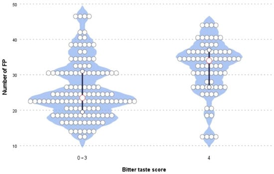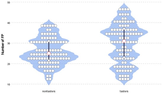 We also noticed differences in FP scores between tasters and nontasters (p = 0.0211). The scores were higher in the group of tasters, for which the median score was 31 (23.0–37.0), than in the group of nontasters, for which the median score was 25 (22.0–31.0) (Figure 2).